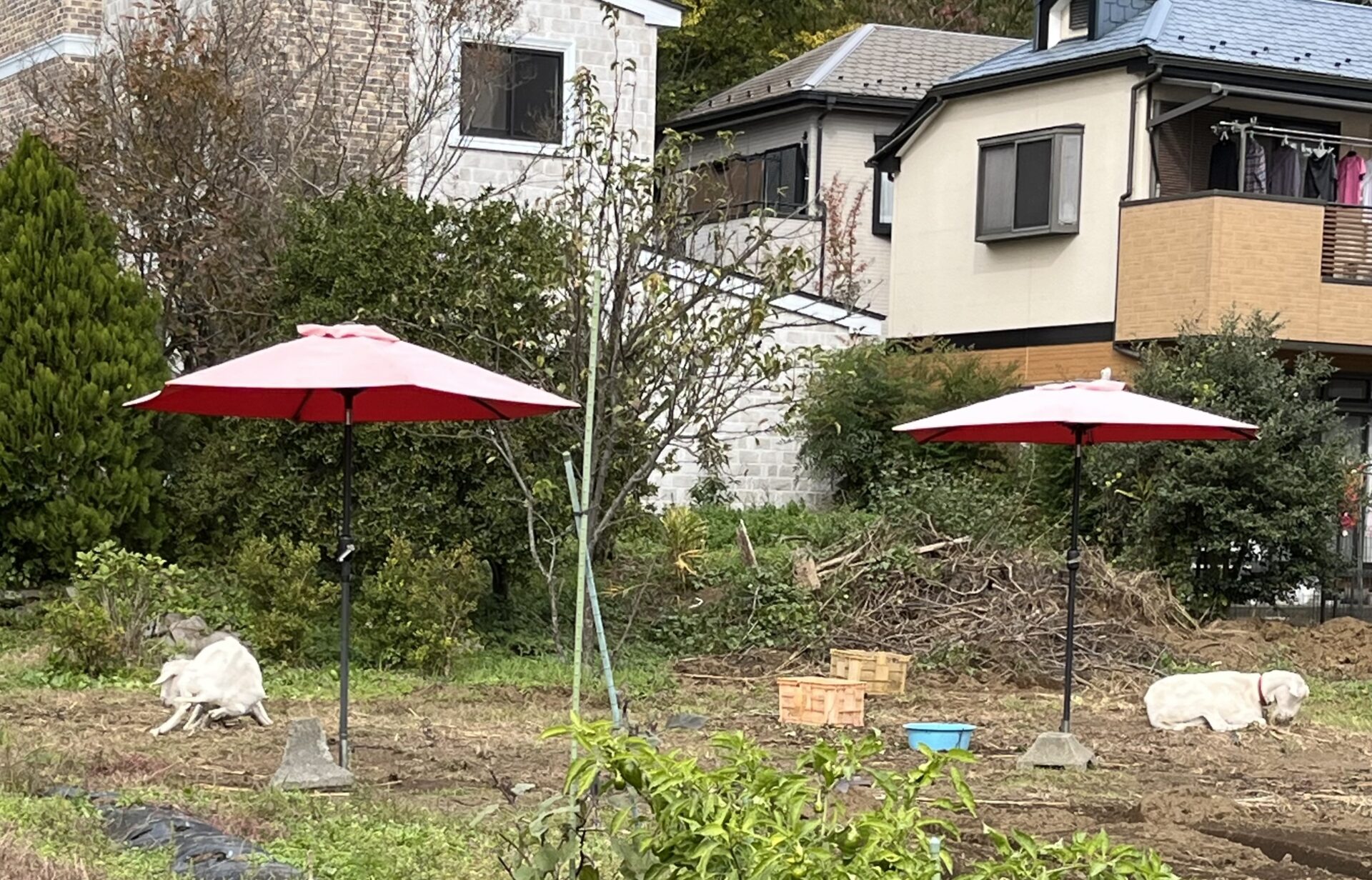 のどかな八王子 みんなのひとりごと 2025.11.13 北野街道を走っていると、赤いパラソル⛱️が・・・気になってよく見ると、ヤギが2頭草を喰んでいました。そして、無農薬で育った大きなサツマイモが売っていました。由井小学校の近くを通ったときには、探してみてください。
